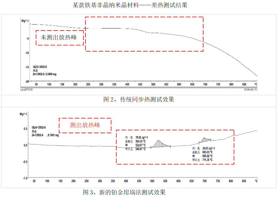 因为铁、钴非晶纳米晶的晶化温度通常在500℃~600℃,而DSC的实际使用温度只有550℃左右,所以,首选的测试仪器是精度相对低的同步热测试仪。