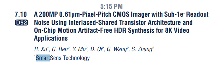 值得一提的是,在这一全球顶尖的学术竞技场中,思特威团队成功入选ISSCC 2026图像传感器与显示器(DS2)分会场论文,展现了公司在超高分辨率、低噪声成像及HDR技术方向的前沿突破。入选论文题为:《A 200MP 0.61um-Pixel-Pitch CMOS lmager with Sub-1e- Readout Noise Using Interlaced-Shared Transistor Architecture and On-Chip Motion Artifact-Free HDR Synthesis for 8K Video Applications(一款面向8K视频应用,具备2亿超高分辨率、0.61μm像素尺寸、小于1e⁻读取噪声以及片上无运动伪影HDR融合等特性的CMOS图像传感器)》。