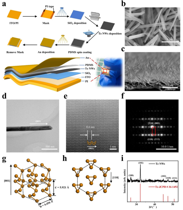 近期,中国科学院金属研究所研究团队研制出基于碲纳米线热电-压电耦合效应的柔性、单通道、应变/应变率-温度多模态传感器。团队通过材料调控和结构设计克服了传统热电材料中,热电和压电信号无法在同一方向获得的难题,在倾斜生长的特殊网状碲纳米线结构中,实现了压电信号和热电信号在面外方向的同时感知和输出。传感器具有优异的性能,应变传感灵敏度为0.454 V、应变率传感灵敏度为0.0154 V s、温度传感灵敏度达225.1 μV K-1,优于已知同类多模态传感器。同时,结合第一性原理计算,团队证明了Te原子电荷的变化引起的压电效应,以及外部电场对于压电信号的调制作用机制。该工作为基于多物理场耦合效应构建柔性、单通道、多模态传感器提供了思路,也为耦合“纳米发电机”开辟了应用方向。