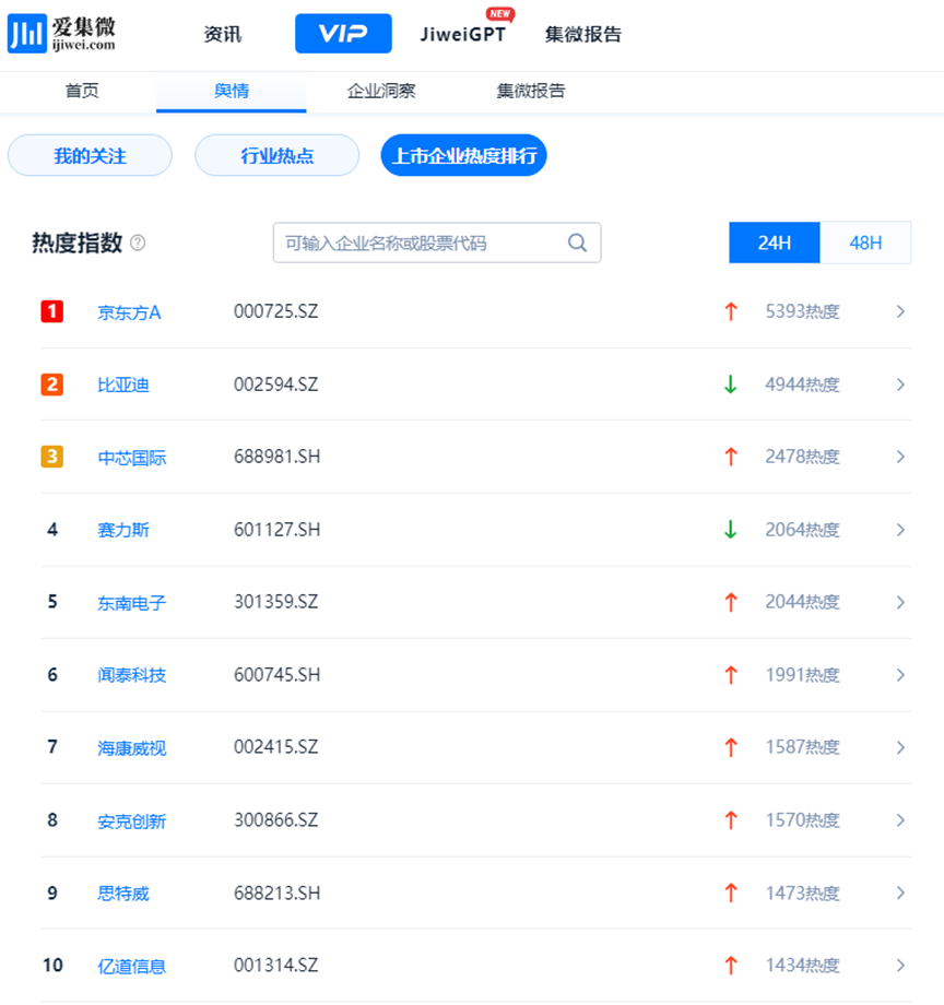 登录爱集微VIP频道,实时查看动态“上市企业热度排行”,穿透洞察每一个波动背后的驱动因素。