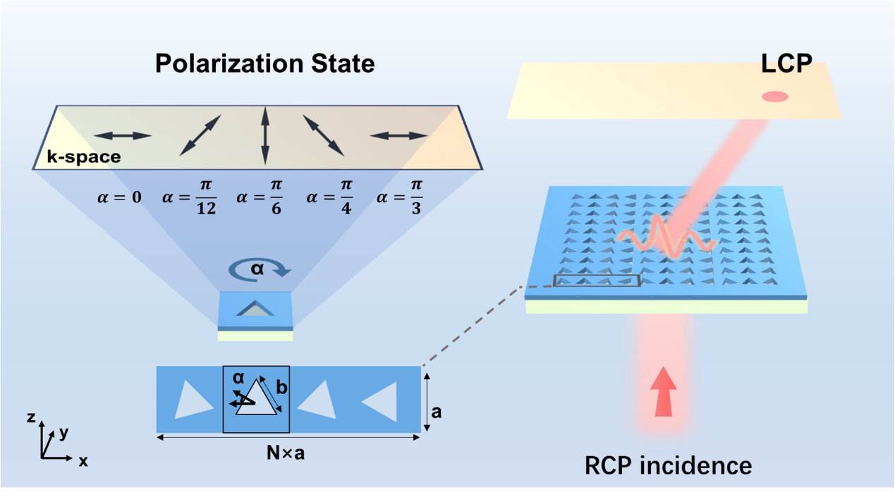 介质光子晶体平板中的导模谐振具有独特的光学响应特性,在低阈值激光、结构光场生成与高灵敏传感等领域展现出广阔的应用前景。在介质光子晶体平板中,通过调控结构单元的空间旋转角度,可使每个单元散射出的光携带与转角线性相关的几何相位。基于这一机制,可将光子晶体平板构建为导模谐振相位梯度超表面,实现波前调控。