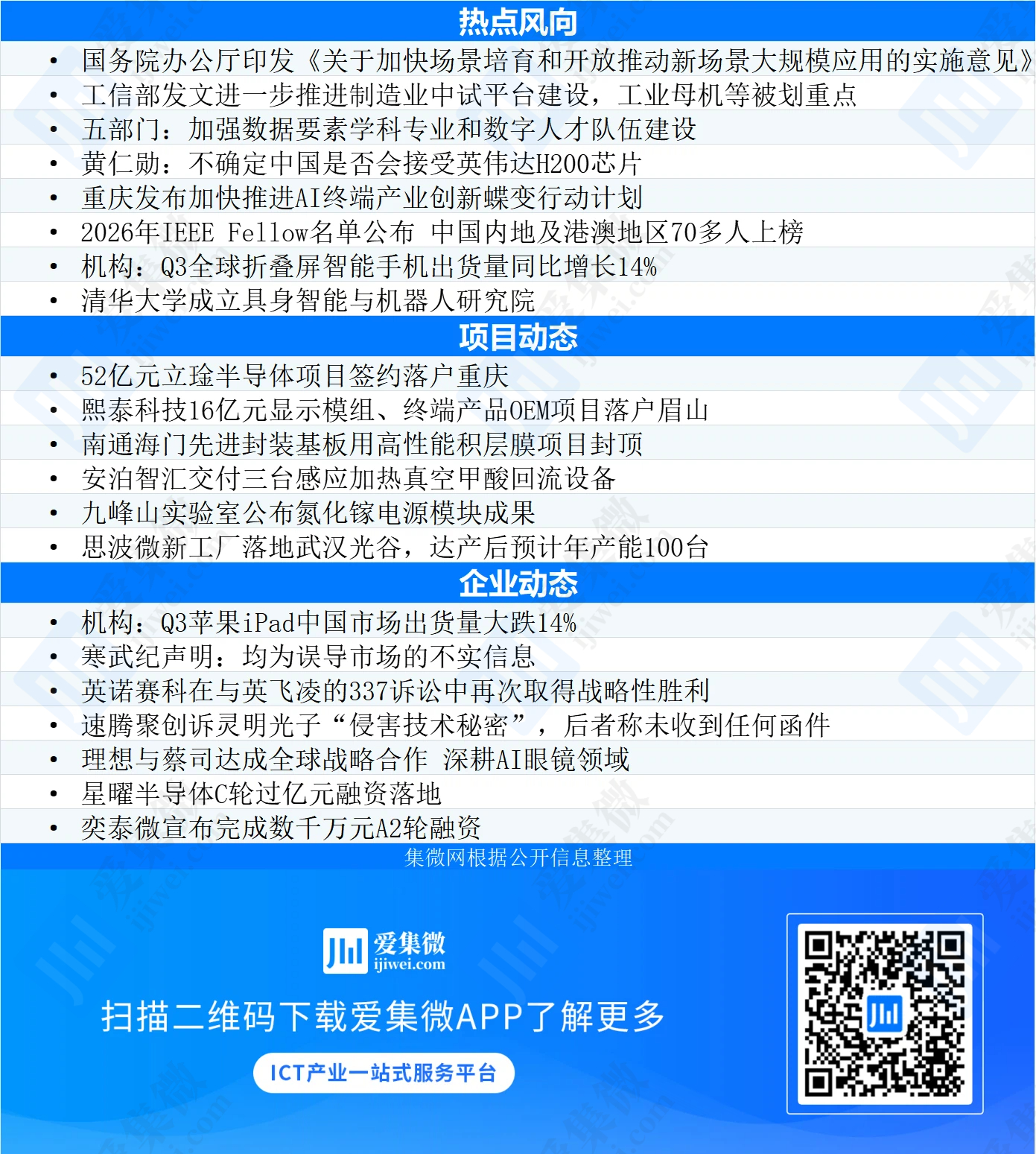 本周以来,工信部发文进一步推进制造业中试平台建设;黄仁勋称不确定中国是否会接受英伟达H200芯片;2026年IEEE Fellow名单公布;52亿元立琻半导体项目签约落户重庆;消息称寒武纪计划将2026年AI芯片产量翻至三倍;英诺赛科在与英飞凌的337诉讼中再次取得战略性胜利……
