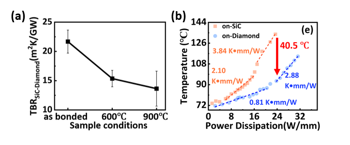 图2 (a) SiC/Diamond界面热阻随退火温度的变化;(b) 基于不同衬底(SiC 与 SiC/Diamond复合衬底)GaN HEMT 结温随耗散功率密度的变化。
