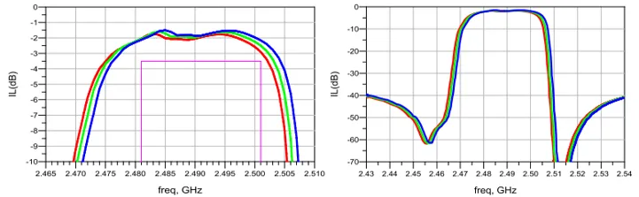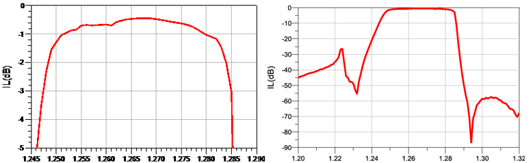 此款产品采用温度补偿(TCF)结构,温度漂移系数在±5ppm/℃以内,大大降低了滤波器在高低温下的温度漂移,从而保证产品具有高滚降,高邻带抑制等特性。