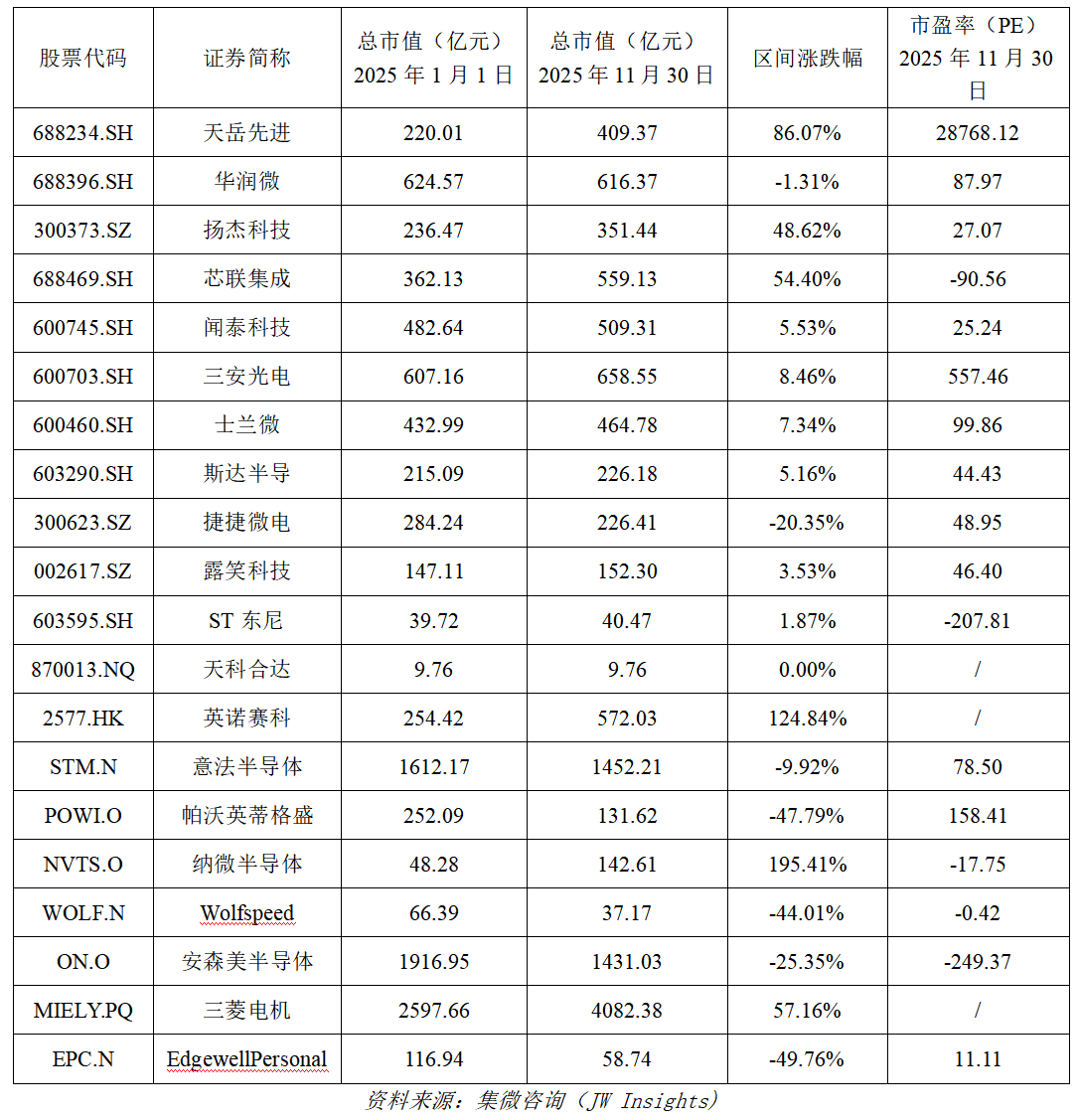 相比2025年初,涨幅前三的国内公司是纳微半导体(195.41%)、英诺赛科(124.84%)和天岳先进(86.07%)。国际巨头中,三菱电机实现大幅上涨(57.16%),而EdgewellPersonal(-49.76%)、帕沃英蒂格盛(-47.79%)和Wolfspeed(-44.01%)等多家企业出现明显下跌。从市盈率来看,截至2025年11月30日,天岳先进市盈率最高(28768.12),其次是三安光电(557.46)和帕沃英蒂格盛(158.41);国际巨头中,意法半导体市盈率为78.50,安森美半导体(-249.37)、Wolfspeed(-0.42)等为负市盈率。