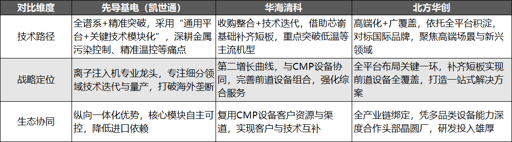 战略定位上,三者呈现明显分层:凯世通以离子注入机专业龙头为核心,专注于该细分领域的技术迭代与量产落地,目标是打破海外巨头在核心场景的垄断;华海清科将离子注入机视为“第二增长曲线”,与现有CMP设备形成协同,完善半导体前道设备产品组合,强化对晶圆厂的综合服务能力;北方华创则将其作为全平台布局的关键一环,通过补齐离子注入机短板,实现除光刻外前道设备的全覆盖,打造国产半导体设备的“一站式解决方案”供应商。
