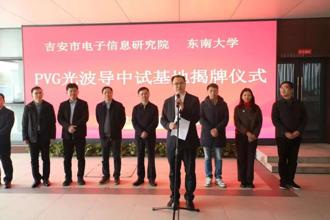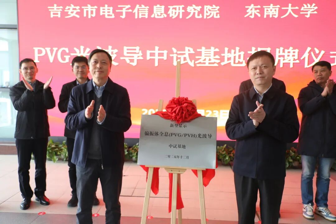 12月23日,“偏振体全息(PVG)光波导中试基地”揭牌和发布活动在江西省吉安市举行。吉安市委常委、副市长、井冈山经济技术开发区党工委书记傅正华,井冈山经济技术开发区党工委委员、管委会副主任戴志敏,东南大学副校长孙立涛,东南大学原常务副校长王保平,东南大学电子学院党委书记江雪华,电子学院院长倪振华以及来自投资机构、产业链合作伙伴的代表60余人共同出席了揭牌仪式和发布活动。