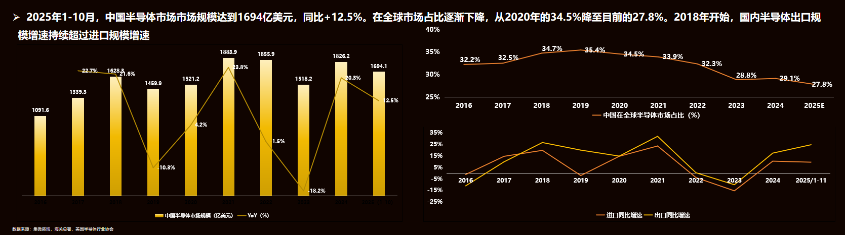 在AI算力需求爆发、政策资本加持与国产替代提速的共同推动下,中国半导体产业在2025年保持了稳健增长,1-10月市场规模达1694亿美元,同比增长12.5%。与此同时,产业结构性变化显现:中国市场的全球占比自2020年的34.5%逐步调整至27.8%;而一个积极信号是,自2018年起,半导体出口规模增速持续高于进口,贸易结构正在优化。
