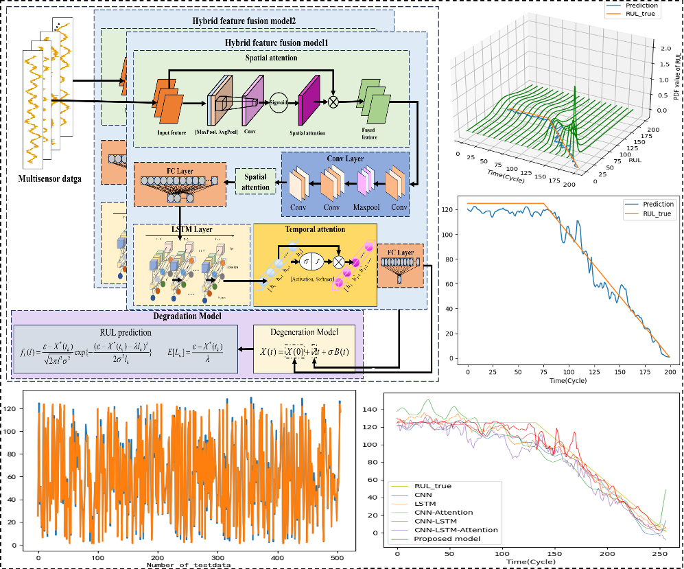 该论文针对多传感器系统中驱动机构剩余有用寿命预测难题,提出了一种基于混合特征融合的随机估计策略。通过卷积神经网络提取传感器间的空间关联特征,利用长短期记忆网络捕捉时序演化规律,创新性引入时空注意力机制,自适应强化退化相关特征的权重。构建基于维纳过程的随机降解模型,结合动态更新的健康指标与降解速率,实现剩余寿命的概率性预测;设计融合预测误差与方差的定制化损失函数,有效提升预测精度与结果稳定性。