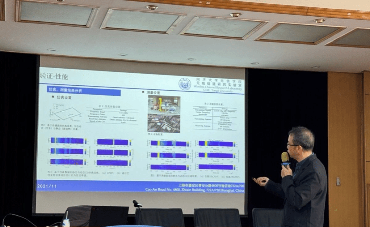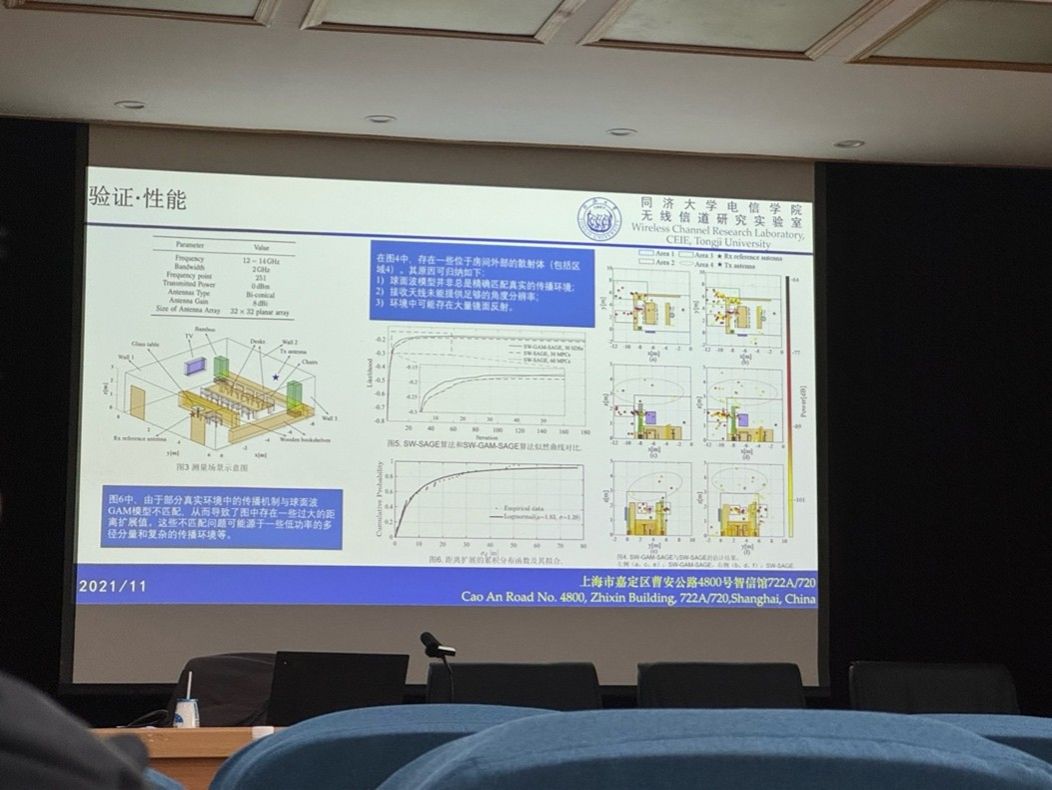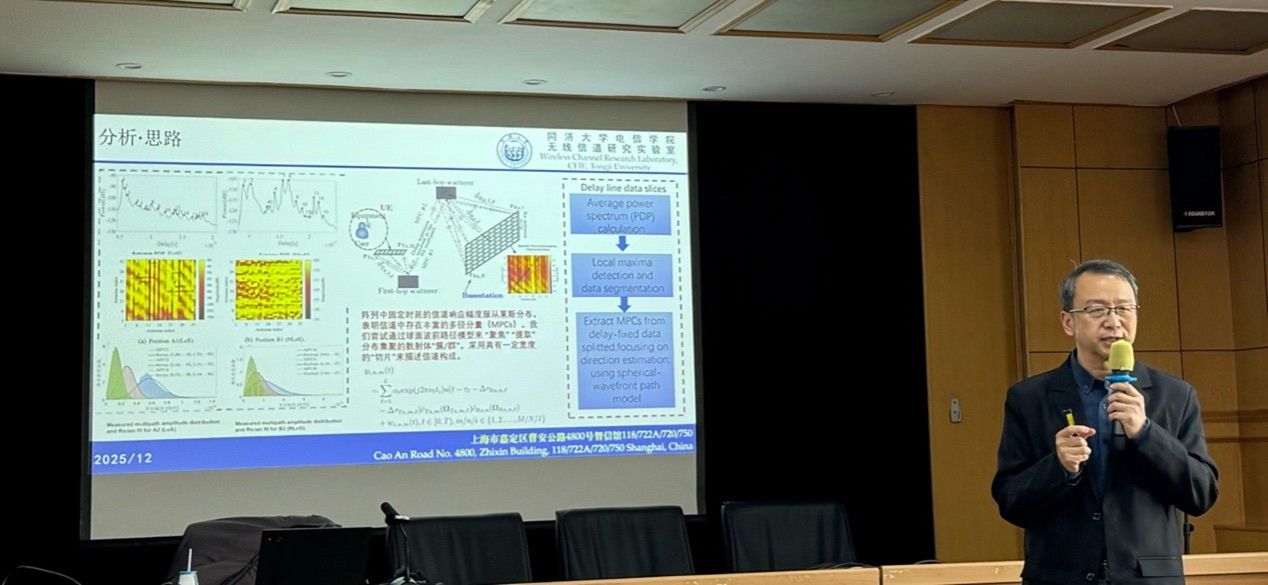 本次讲座的报告围绕四个方面展开,分别是超大规模天线阵列场景下基于分段数据的高分辨率多径分量估计、面向参数估计的公共/非公共空间分离、车载雷达场景下的拓扑参数估计、基于混合模型的无扩散路径与扩散路径参数估计。针对超大规模天线阵列场景下基于分段数据的高分辨率多径分量估计,尹教授指出,在超大规模阵列下,室内传播大量处于近场,传统平面波模型难以刻画,需要引入球面波建模以应对更强的空间非平稳性。报告结合仿真和实测对包含功率时延分布(PDP)的信道统计特性进行分析,单一时延簇内往往叠加多条多径,逐径消除易受校准误差影响产生参数漂移,因此提出时延切片结合球面波建模的思路对传统SAGE算法进行改进,实现簇内更精细、更稳定的高分辨率多径提取。