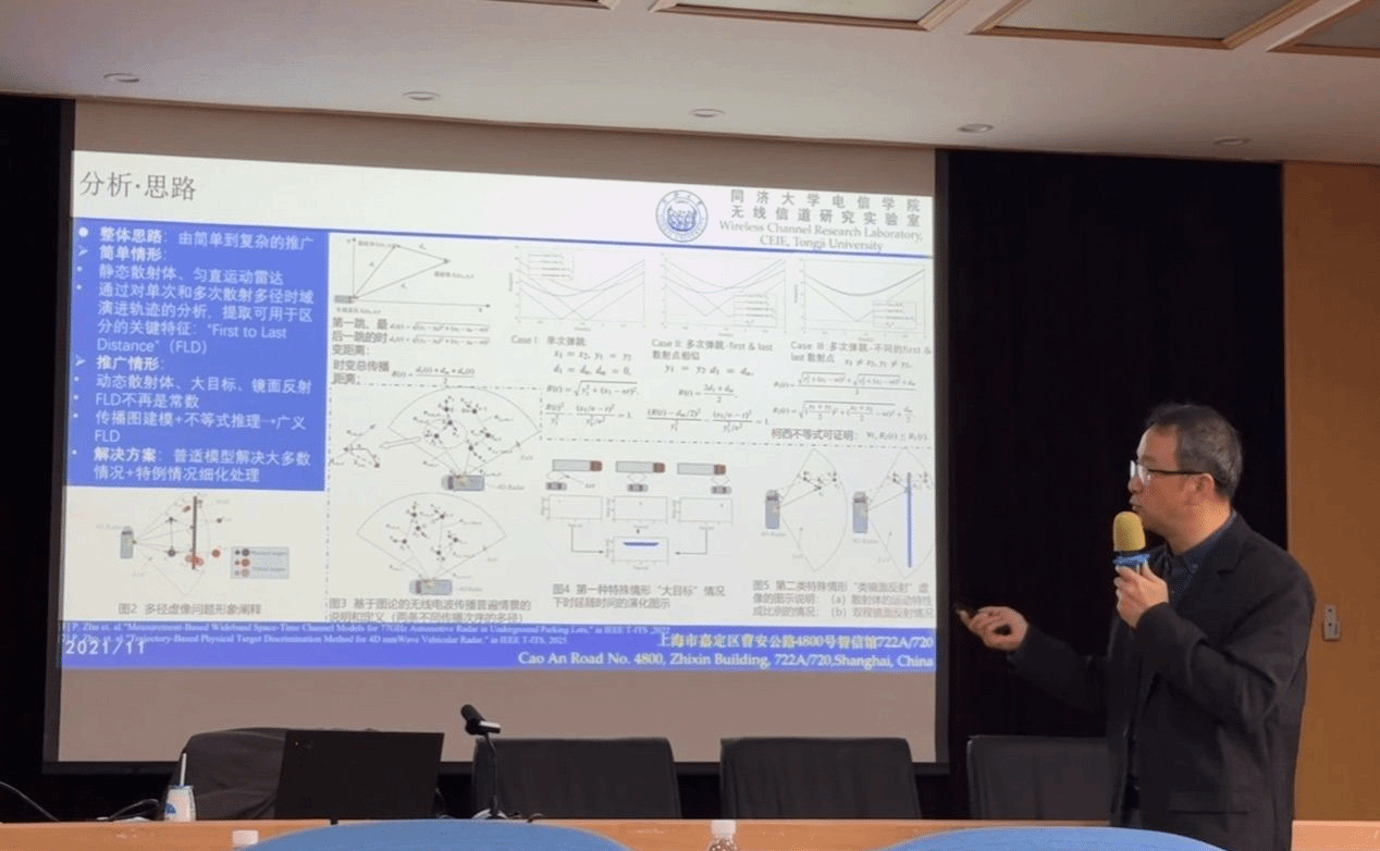 在第三部分车载雷达场景下的拓扑参数估计中,针对车载毫米波雷达中的多径虚像难题,尹教授在报告提出用传播路径的First to last distance (FLD)来区分单跳/多跳及大目标反射等不同机制。方法上利用多径随时间演化形成的“双曲线”特征,基于双曲线预检测估计关键几何参数,并据此对路径类型进行判别与筛选。仿真与实测显示该确定性算法无需大量训练数据,具备工程落地潜力。