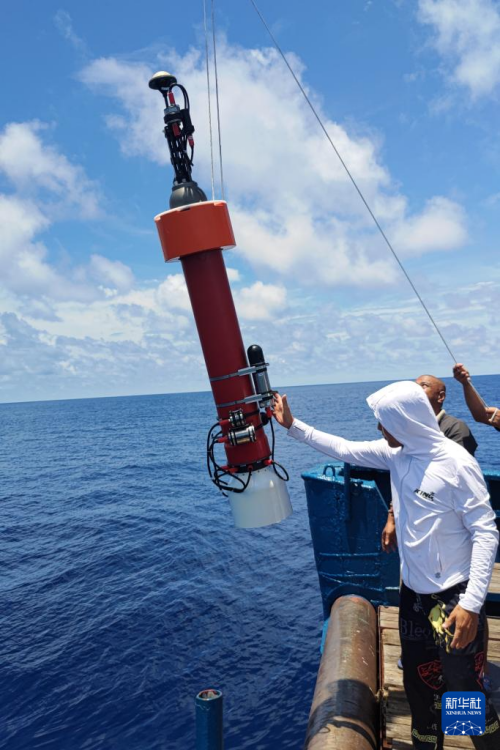 ▲这是我国自研海洋生物地球化学原位传感器搭载Argo浮标海试布放现场(2025年5月15日摄)。