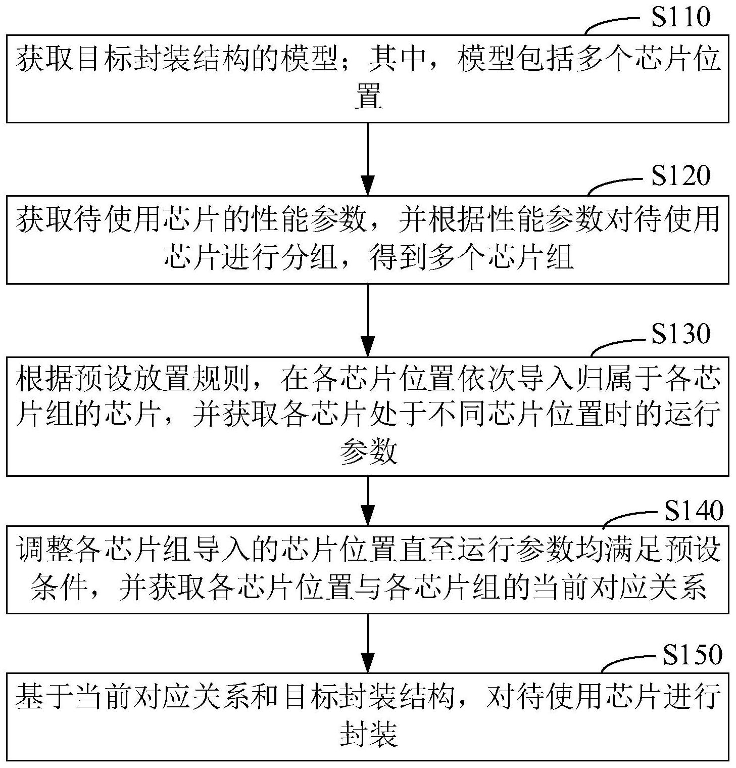 本申请涉及一种芯片封装方法、装置、计算机设备和存储介质。其中,芯片封装方法包括获取目标封装结构的模型;其中,模型包括多个芯片位置;获取待使用芯片的性能参数,并根据性能参数对待使用芯片进行分组,得到多个芯片组;根据预设放置规则,在各芯片位置依次导入归属于各芯片组的芯片,并获取各芯片处于不同芯片位置时的运行参数;调整各芯片组导入的芯片位置直至运行参数均满足预设条件,并获取各芯片位置与各芯片组的当前对应关系;基于当前对应关系和目标封装结构,对待使用芯片进行封装。通过上述芯片封装方法,使得芯片封装过程中能够基于芯片组和芯片位置的对应关系进行封装,进一步提高了该封装结构下模块的整体性能。