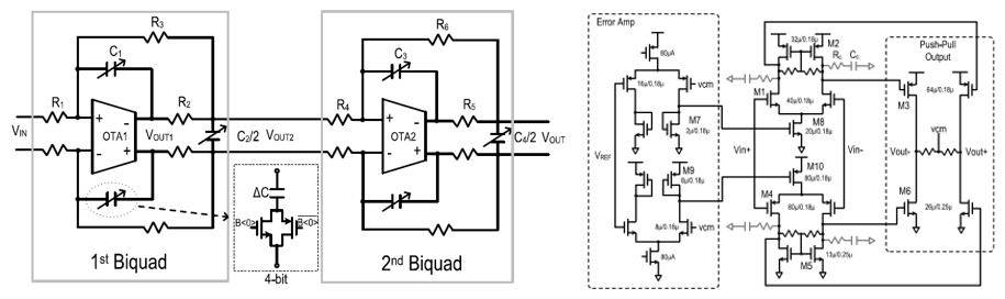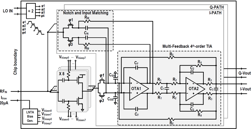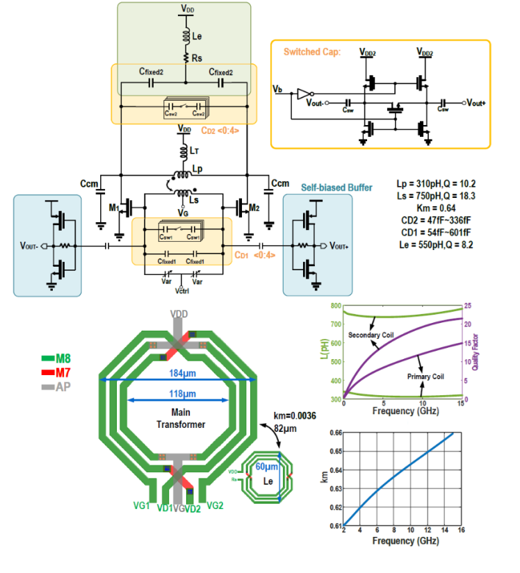 课题组面对新一代无线通信系统的高带宽要求,提出并流片验证了一种基于多栅平均偏置技术的低噪声跨导放大器前端,有效提升了接收前端的抗阻塞性能和能效;同时,在模拟基带等模块,提出了互补输出的两级高能效运算放大器,实现了在高带宽应用场景下模拟基带滤波器的能效;在应对高速通信系统中电压控制振荡器1/f³相位噪声优化的关键挑战时,提出了一种LC串联辅助谐振器,解决了传统Class-F₂₃ VCO需要手动调谐以及现有方案在面积和工艺鲁棒性上的不足。