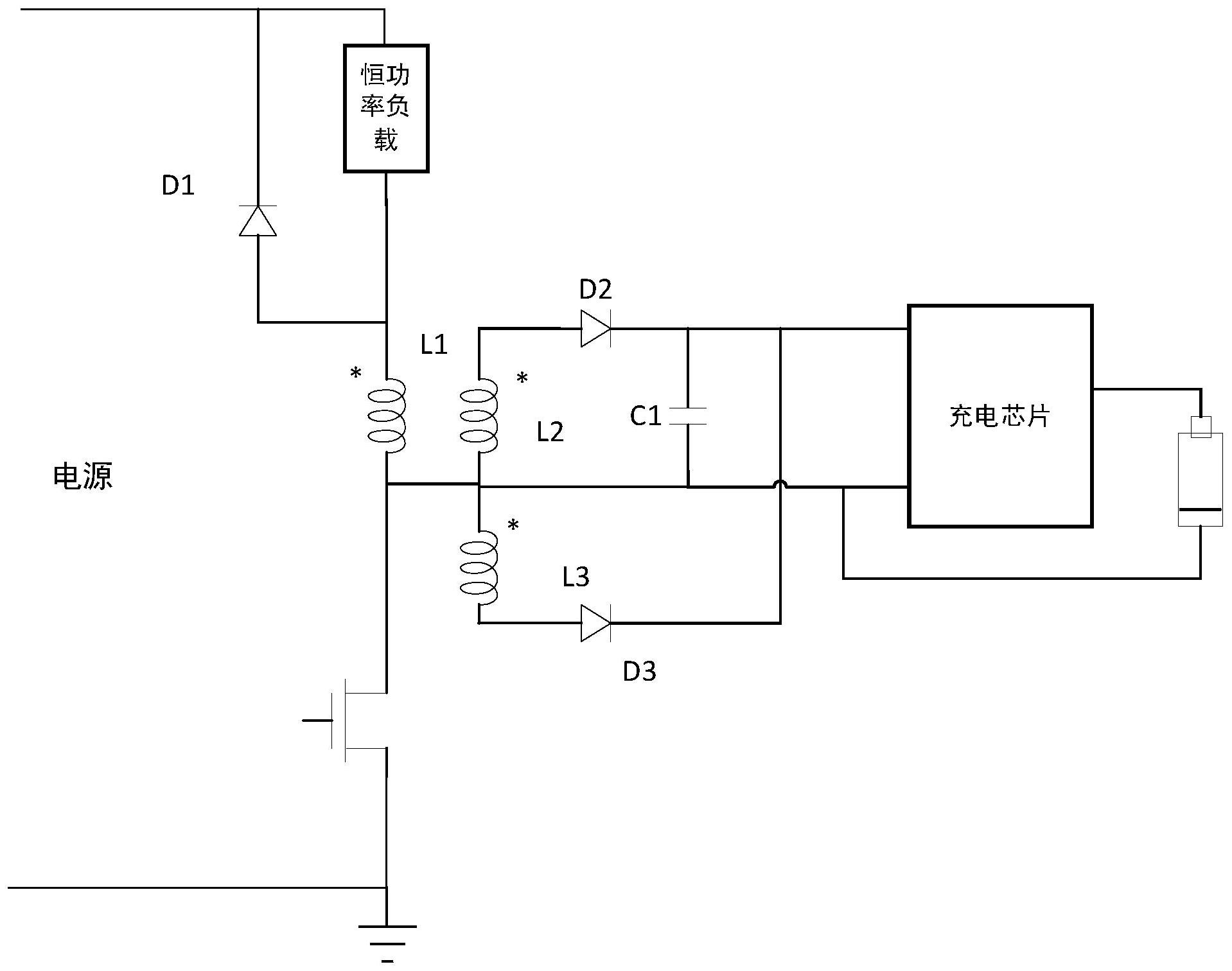 一种恒功率大电流充电系统,包括充电芯片、电感L1,L2,L3、开关晶体管、二极管D1,D2,D3和电容C1;锂离子电池接在充电芯片的输出端和芯片地之间;电感L2的异名端、电感L3的同名端与电感L1的异名端接芯片地,电感L2的同名端与通过二极管D2接充电芯片的输入端,电感L3的同名端与通过二极管D3接所述充电芯片的输入端,电容C1连接在所述充电芯片的输入端与芯片地之间,其中,电感L1的负载是恒功率时,电感L1存储的能量感生到电感L2和电感L3,以使所述充电芯片的源也是恒功率。因此,本发明不仅实现了涓流、恒功率、恒流和恒压的充电方式,同时还兼顾了大电流充电和充满电的需求。