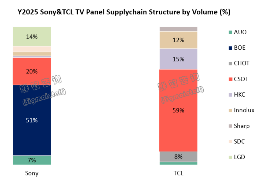 从面板供应端,2025年TCL电视近60%面板来自华星光电;索尼面板采购则以京东方为主、华星为辅。随着TCL和Sony开启战略合作,预计未来Sony面板的资源或将进一步向TCL华星倾斜,从而加入华星阵营。