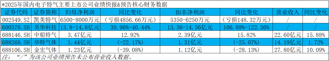 2025年,在国产替代加速、下游新一代信息技术需求增长的背景下,中国电子特气行业上市公司业绩表现呈现显著分化。部分企业凭借业务布局优化、核心产品竞争力提升实现业绩增长甚至扭亏为盈,而部分企业则受市场竞争、成本压力等因素影响出现利润下滑。根据目前金宏气体、昊华科技、中船特气、华特气体、凯美特气已发布的2025年业绩预告及快报数据,从净利润表现和业绩变动原因两方面进行对比分析,可拆解行业发展态势与企业经营差异。