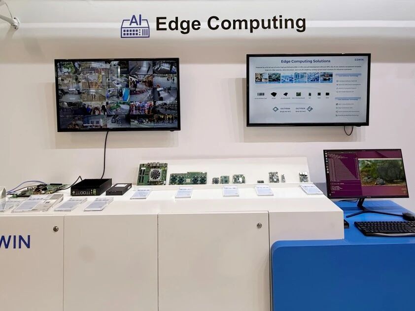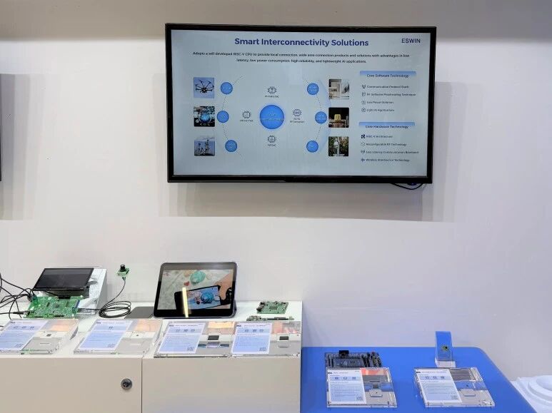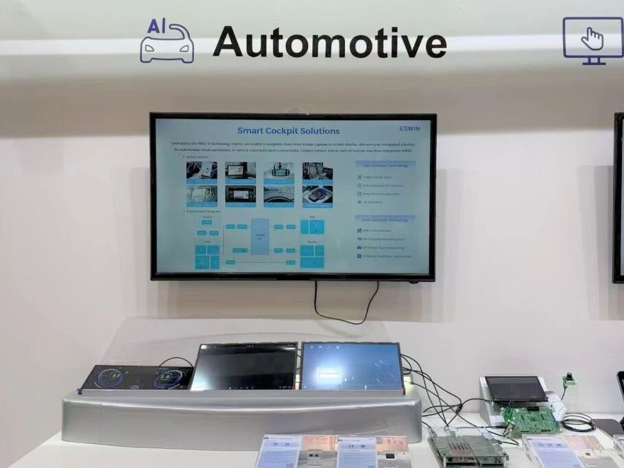 此次展会,奕斯伟计算重点展示了边缘计算、智能终端、智能座舱三类应用场景的芯片与解决方案,全面呈现RISC-V技术在嵌入式场景的落地实力。其中,边缘计算领域展出EIC77系列产品,涵盖开发板、AI Box、AI PC及加速卡等丰富形态,可广泛应用于智慧园区、智慧教育、机器人等多个场景;智能终端领域呈现了基于RISC-V的触控、多媒体及无线连接解决方案,包括水下触控芯片、MNT Scaler、Wi-Fi/BLE SoC等,适配多类终端应用需求;智能座舱领域采用“四合一”展示形式,集中呈现针对智能座舱的全套解决方案,整合电子后视镜专用RISC-V SoC、SerDes、车规级MCU、车载触控芯片、车载LTDDI芯片、车载PMIC等产品,多方位展现产品在中控、副驾、仪表、电子后视镜等智能座舱与车身控制场景中的应用,为观众带来直观的产品体验。