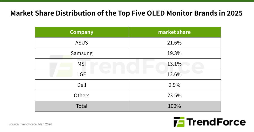 近年来,微星科技(MSI)积极拓展OLED游戏显示器市场,2025年以13.1%的市场份额位居全球第三。