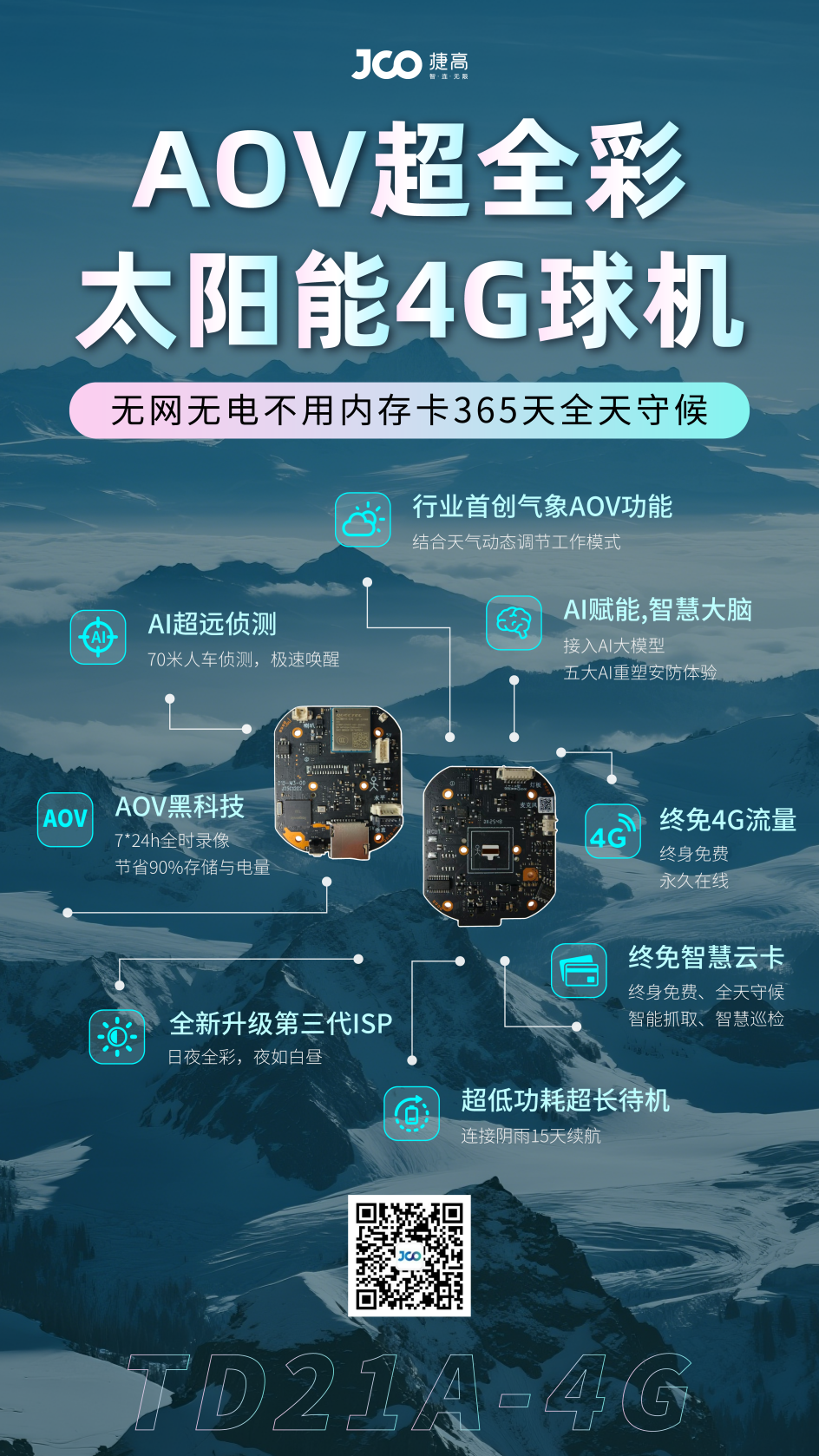 在视觉科技飞速迭代的当下,低功耗、高性能的视觉解决方案已成为行业竞争的核心赛道。作为视觉芯片领域的深度参与者,君正凭借持续的技术深耕,与合作方捷高携手,不断推动AOV(Always on video)技术的迭代升级。从2023年首次提出AOV概念,到2025年T32芯片的技术突破,再到如今T33芯片的全新焕新,双方以技术创新为基,以市场需求为导向,共同打造出兼具竞争力与实用性的捷高TD21A-4G产品,为视觉应用场景注入全新活力。