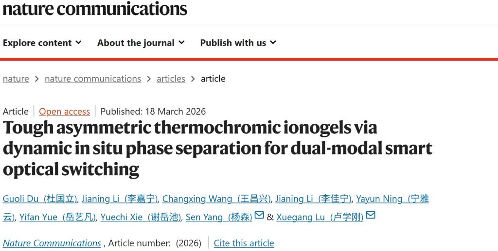 该成果以“Tough asymmetric thermochromic ionogels via dynamic in situ phase separation for dual-modal smart optical switching”为题发表于国际权威期刊《自然·通讯》(Nature Communications)。西安交通大学物理学院为论文唯一通讯单位,第一作者为物理学院2024级博士生杜国立,物理学院卢学刚教授、杨森教授为论文通讯作者。该研究得到了国家重点研发计划、国家自然科学基金、中国载人航天工程空间应用系统项目以及陕西省自然科学基金等项目的资助。