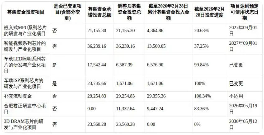 注:"车载LED照明系列芯片的研发与产业化项目"变更为"合肥君正研发中心项目","车载ISP系列芯片的研发与产业化项目"变更为"3D DRAM芯片的研发与产业化项目"。